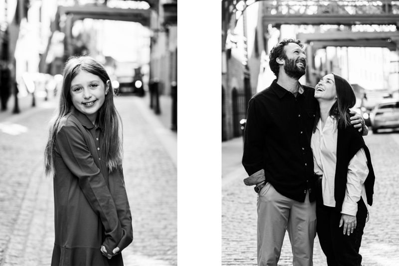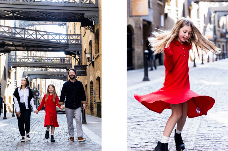 To finish, we crossed Tower Bridge for a few lively shots. This included a playful “London” moment with a red bus whizzing past in the background. Then we headed to Shad Thames, one of my favourite streets in the city, with its cobbled pathways and historic Victorian warehouses. The family’s daughter couldn’t resist dancing in the street, a moment that perfectly captured the fun and freedom of travel. I was so happy with all the Tower Bridge vacation portraits we got during the session, full of the joy of family adventures together.