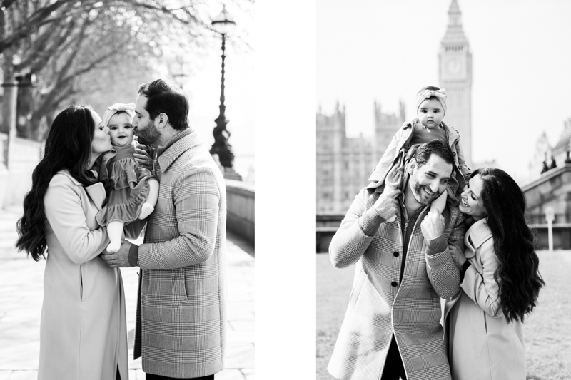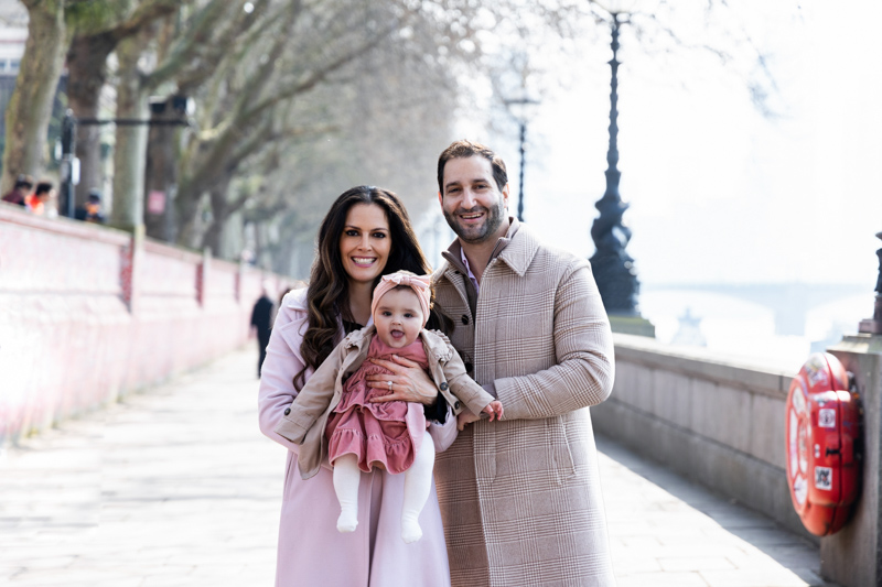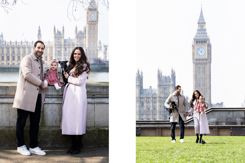 I loved this family photography session so much, and during it I took one of my favourite photographs of the year! The session took place right in the heart of Westminster, with the iconic Houses of Parliament providing a magnificent backdrop to the photographs. This lovely family — mum, dad, baby girl, and their energetic dog — brought so much joy to the morning. It really was lovely to get to know them. We began with a few Westminster family photos in front of Big Ben, such a famous London landmark. Afterwards we took some adorable portraits of the baby girl and her little furry best friend.